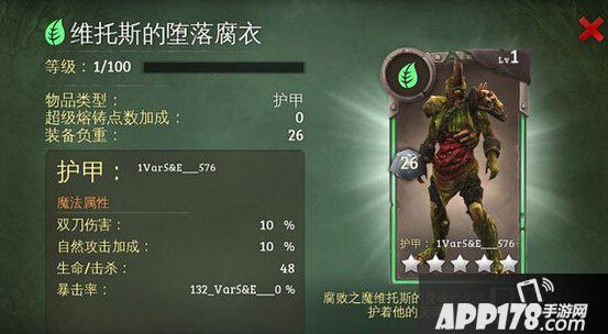 装备介绍:腐败之魔维托斯的灵魂已化为碎片,这件护甲即保护着她的灵魂也囚禁这它的灵魂。