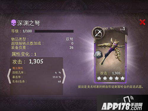 地牢猎手5死亡属性五星双弩图鉴介绍!地牢猎手5是一款非常好玩的手机游戏,在这款游戏中有着大量的装备可以供我们选择,今天APP178手游小编给大家带来这款游戏中的五星死亡属性双弩的图鉴介绍,希望大家喜欢!
