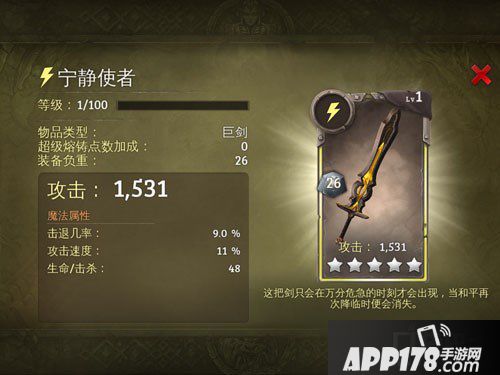 APP178手游网>地牢猎手5>游戏攻略>地牢猎手5光明属性巨剑 宁静使者图鉴详解介绍
