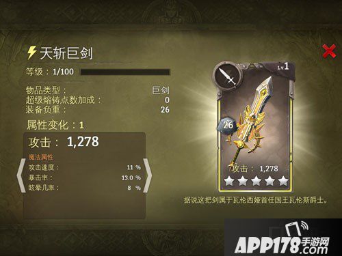 APP178手游网>地牢猎手5>游戏攻略>地牢猎手5光明属性装备 天斩巨剑属性介绍