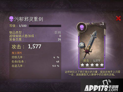 地牢猎手5死亡属性污秽邪灵重剑图鉴!地牢猎手5是一款非常好玩的手机游戏,在这款游戏中一共有五种属性,每一种属性都有自己不同的装备,今天APP178手游小编给大家带来的是死亡属性污秽邪灵重剑图鉴,希望大家喜欢!