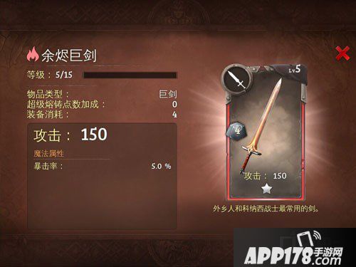 APP178手游网>地牢猎手5>游戏攻略>地牢猎手5烈焰属性武器 余烬巨剑属性介绍