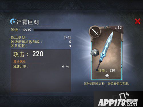 APP178手游网>地牢猎手5>游戏攻略>地牢猎手5寒冰属性武器 一星巨剑严霜巨剑