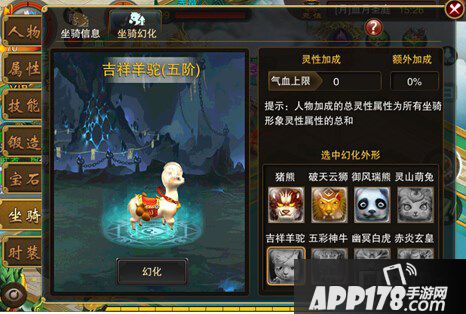 坐骑每一阶对应一个外形,当对应的外形被激活时(坐骑进阶时获得),坐骑下方出现“幻化”按钮,点击幻化坐骑当前坐骑切换为当前形象;
