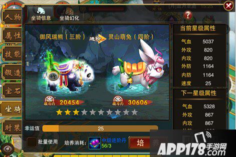 使用进阶丹可对坐骑进行培养,坐骑每满10星则升级为下一阶;