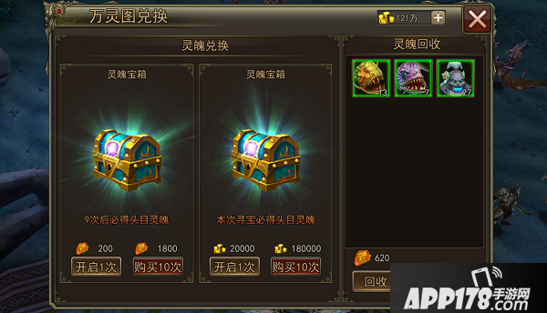 l获得的多余灵魂碎片,可以在‘灵魂兑换’界面进行回收。同时,这里还能够使用回收币 或者 游戏内金币抽取更多的灵魂碎片;