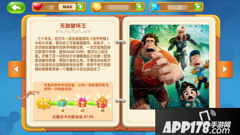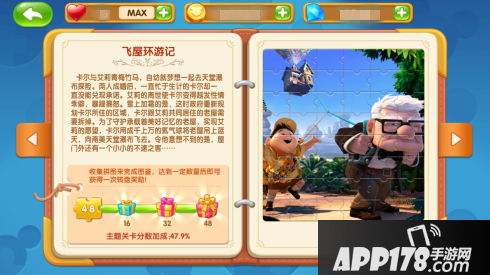 《迪士尼奇幻之旅》目前开放四个主题,冰雪奇缘、飞屋环游记、无敌破坏王以及长发公主,玩家通过充分完成各个主题关卡,可以获得对应主题的图鉴。