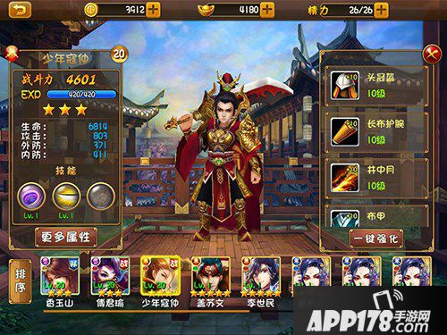点击【装备】,可以看到页面这位英雄的装备,点击一键强化,就可将目前的所有装备提高一级。小编的少年寇仲装备等级还比较低,需要继续努力~