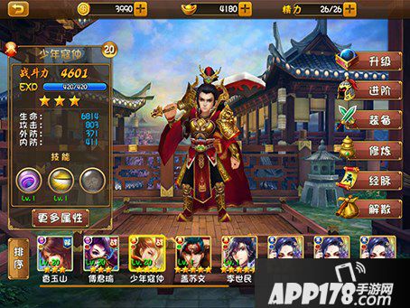 小编最喜欢寇仲,所以先选择少年寇仲进行养成,右侧依次有升级、进阶、装备、修炼、经脉、解散。