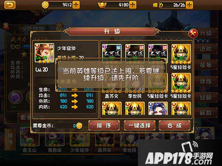 玩家在选定需要养成的英雄之后,点击【升级】,如果该英雄的等级没有达到上限,点击升级后,英雄的级别会提高;如果该英雄的等级已经达到上限,刚无法继续升级,必须先升阶才能进行英雄升级。