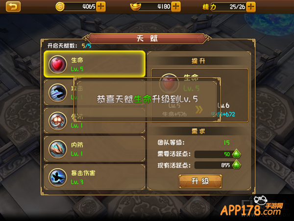 在天赋系统的界面中,可以激活的天赋种类是由玩家所带领的团队等级决定的。玩家们通过升级操作可以提升不同的天赋属性效果。小编这里要提醒各位玩家,天赋升级过程是需要消耗活跃点的。