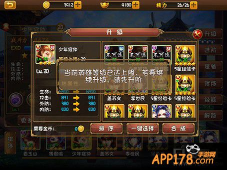 玩家在选定需要养成的英雄之后,点击【升级】,如果该英雄的等级没有达到上限,点击升级后,英雄的级别会提高;如果该英雄的等级已经达到上限,刚无法继续升级,必须先升阶才能进行英雄升级。