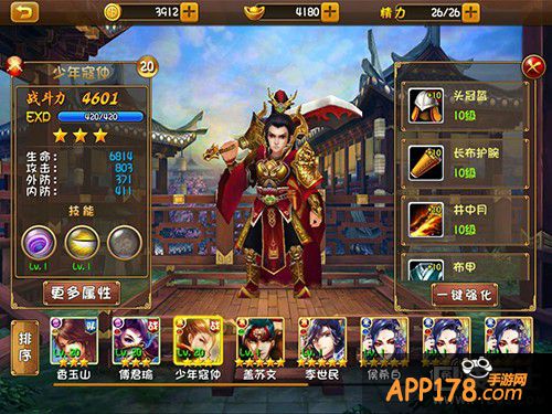 点击【装备】,可以看到页面这位英雄的装备,点击一键强化,就可将目前的所有装备提高一级。小编的少年寇仲装备等级还比较低,需要继续努力~
