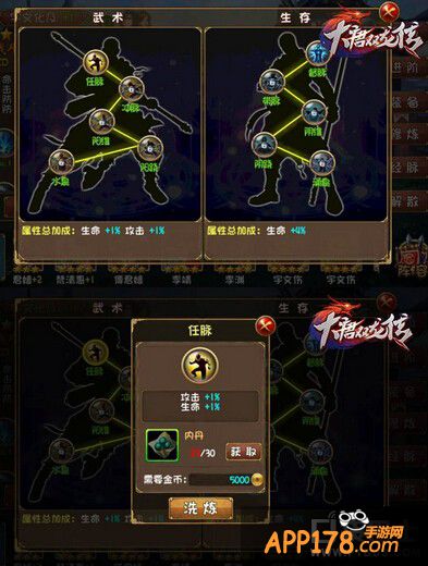 当英雄+3之后可开启经脉系统,分为“武术”和“生存”两条经脉,玩家可以根据通过消耗内丹和渡厄丹来开启,开启后的经脉还可以通过洗练获得更高更好的属性加成。