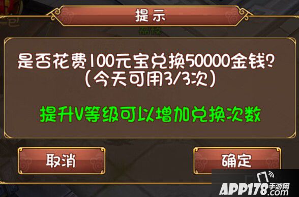 点击主界面金钱后面的加号就会出现元宝兑换金钱的对话框了,VIP等级越高兑换的次数也就越多。