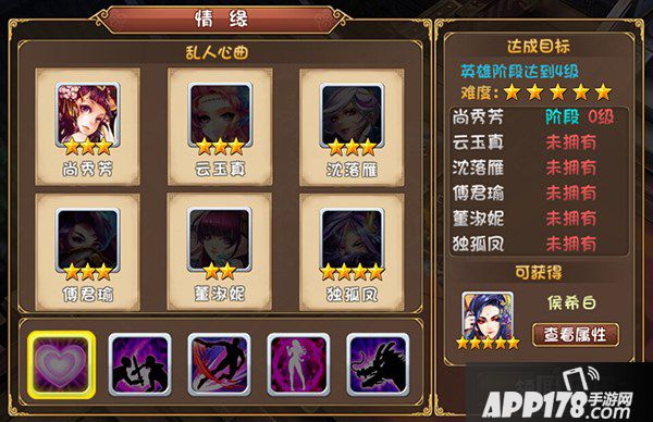 情缘难度为五颗星,达成情缘乱人心曲可以获得五星英雄侯希白。