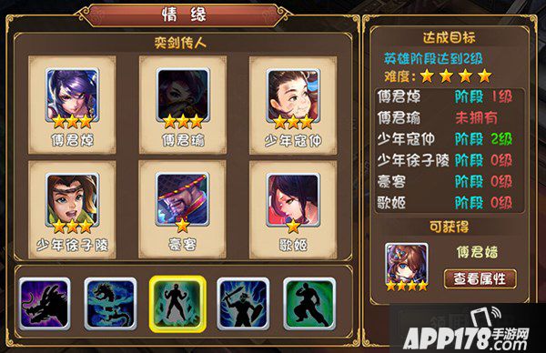 情缘难度为四颗星,达成情缘奕剑传人可以获得四星英雄傅君嫱。
