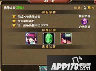 如上图在“洛阳金钟”这一关,玩家必须完成关卡洛阳金钟时没有角色阵亡,并且任一角色血量不低于50%,才能获得三星关卡。 所以大家在进入副本之前,一定要认真阅读三星条件,有的时候不是单纯的越快通关就越好的哦!所谓工欲善其事,必先利其器。所以审题非常重要!