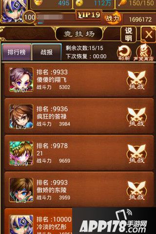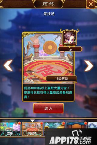 玩家每天与竞技场中的高手过招都可以获得声望与大量元宝奖励,奖励会随着挑战的排行名次而逐一提升难度,排名越高,奖励越是丰富。玩家们每天都可以享有15次挑战机会,当然,挑战前别忘了提前排兵布阵,根据英雄的类型提前配对好与攻方相克的阵容,与此同时,玩家们如果前期挑战的话建议上一些例如张三丰,东方唯我,九天童姥这等群攻英雄。
