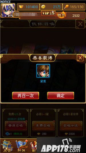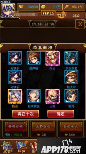 “召唤十次”是游戏中最高规格的招募方式,招募成本是游戏中最高的,同时回报也很让人满意。人品爆棚的玩家甚至有可能获得紫色+橙色的伙伴,在有大量元宝储备的时候,这绝对是玩家扩充阵容的最佳选择。