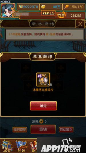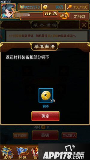 6.重铸时,当有两件及以上已强化或已精炼的装备时,会根据所选材料装备的强化、精炼等级返还部分铜币。