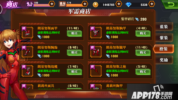 装备是EVA特色强化途径。装备的品质由高到低分为橙,紫,蓝,绿四种。品质越高套装属性也越高。装备分为不同的套装,集齐2件,4件,6件分别能激活一条套装属性。装备可以进行强化,进阶2种操作。
