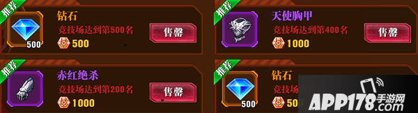 在竞技场”商店“的”奖励“里用”荣誉勋章“购买竞技场达到400名可购买的”天使胸甲“紫色装备和排名200可购买的”赤红绝杀“紫色武器装备。”