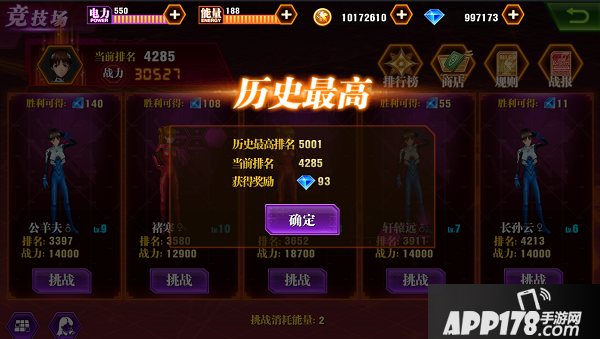 12级游戏的历练功能开放“竞技场”,在“竞技场”中我们可以获得大量的钻石,每次挑战需要2点能量,与玩家战斗中可以通过“跳过”直接观看战斗结果。但是在战斗过程中你可以控制释放自己指挥官技能和EVA技能,所以在竞技场中掌握战斗变得尤为重要。由于我们的等级太低,先不用花费过多的能量在此。竞技场每次进入历史最高排名能获得钻石奖励。