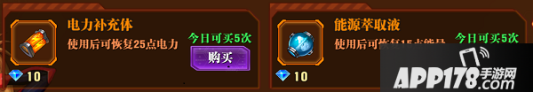 然后进入前期我们最重要需要策略的地方。将“商城”中的“电力补充体”(回复25电力)限购五次,“能源萃取液”(回复15点能量)限购五次全部购买。