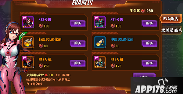 4.最重要的途径便是通过“驾驶员商店”和“EVA商店”用“生命体”(可通过分解EVA得到)购买EVA碎片,用“智慧体”(可通过分解驾驶员得到)购买驾驶员碎片。每日可免费刷新10次商店,使用刷新令或者20钻石可额外刷新10次。通过此方法获取自己需要的EVA和驾驶员碎片,收集最好有自己的一个明确目标,不要见到四星橙碎片就购买,良好的EVA和驾驶员搭配才是你战斗力提升的最好方式。