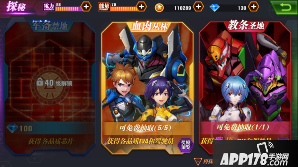 所以咱们首先要学会的就是召集EVA伙伴与驾驶员!在游戏主界面的右边,我们能看见有一个【探秘】的按钮,点击这里就可以进入召集EVA和驾驶员的界面了。探秘分为三种,军备禁地、血肉丛林、教条圣地。作为新人驾驶员,我们常用的就是 血肉丛林 和 教条圣地。这里都能召集到EVA和驾驶员,而教条圣地中能召集到的EVA和驾驶员则更加厉害。每隔一段时间都有免费召集可以使用,之后额外的探秘则需要花费一定钻石或金币才能使用了。