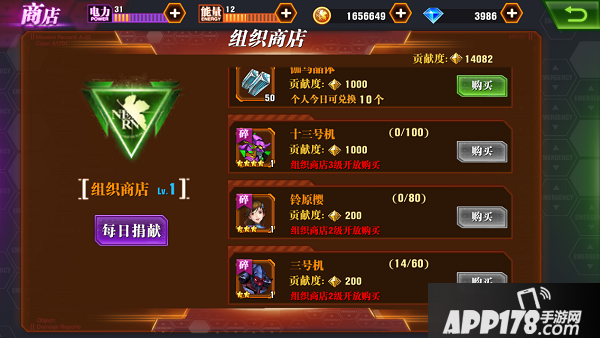 大家别忘了每天的组织捐献,推荐玩家进行中级以上捐献,能获得大量贡献度去组织商店里兑换资源。可以加个高等级组织,组织商店里的进阶晶体、同步药剂、伽马晶体都是必买的,而且组织商店还是十三号机和三号机碎片产出的重要途径。