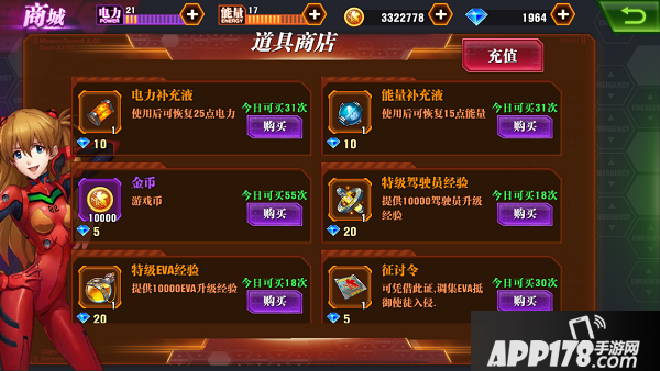 平民玩家等级提高了以后,后期等级提升缓慢,就需要通过不断地扫荡来获取经验。但是电力肯定不够用的,因此平民玩家可以在道具商店中购买电力补充液,V4以下推荐每天买完,这样子才能跟上大佬的步伐,要知道等级才是王道。