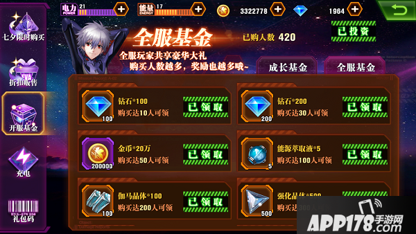 开服基金是小编认为最划算的,开服必买,只需花少量的钻石就能获得总计10000的钻石。最关键的是,全服玩家共享豪华大礼,购买人数越多,奖励越多。