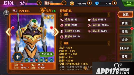 首先来看属性,零号机的防御值是初号机防御的两倍多,并且比4星二号机兽化的防御还高将近5000,可见是多么恐怖的防御能力。零号机的闪避率和抗暴率也是超群的。14.3%的闪避率和10.1%的抗暴率是其他机甲所不及的。初号机的闪避率和抗暴率是4%左右,二号机兽化的闪避率和抗暴率虽有所提高,但与零号机相比,还是有很大差距。