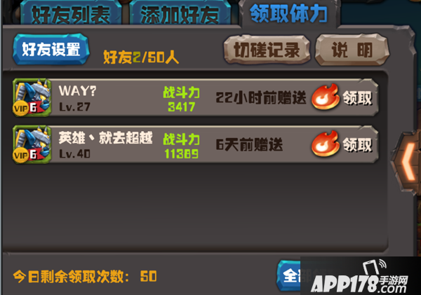 5. 好友赠送体力,每天最多可领取好友赠送的五十次体力,每次一点体力。