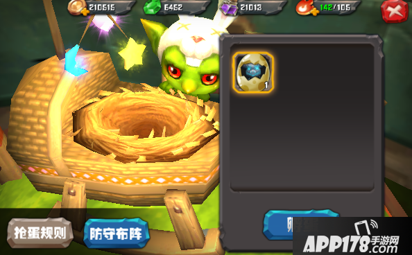 孵化蛋,根据蛋的品质不同,孵化时长不同(品质越高孵化时间越长),也是宝宝主要产出之一,不要忘记设置防守布阵,以免自己辛苦孵化的宝宝被被人抢去。