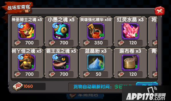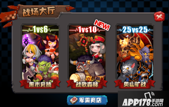 通过黑市竞技、战歌森林可获得战场军需币,进入军需商店可兑换各种物资奖励。
