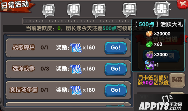 在做日常活动领取团队经验的同时,每个活跃度宝箱都很丰富,不可以错过领取哦。