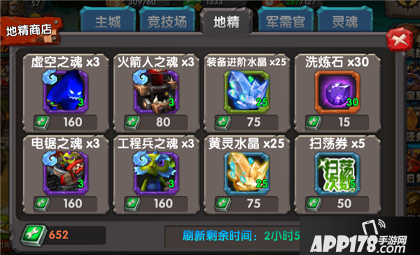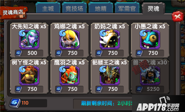 5.灵魂商店。在所有商店里面,灵魂商店是最特殊的一种。在灵魂商店里面,你可以购买到任何一种游戏内存在的英雄和宝宝的灵魂。不管是能水晶抽到的,或者是水晶不能抽到的,通通都有可能出现在灵魂商店里,每次每种灵魂出现的个数有可能是5个,有可能是10个,也有可能是30个,一旦出现了中意的灵魂,不要手软,妥妥的买下来吧。 灵魂商店每天上午冷却时间为3个小时,下午为2个小时。每天24点到凌晨5点不刷新。