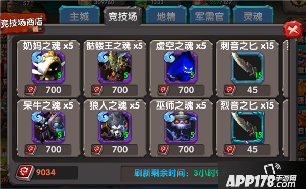 2. 竞技场商店。竞技场商店固定刷新的是4种英雄和2种宝宝的灵魂:奶妈,骷髅王,呆牛,狼人。虚空和巫师。还有就是3种低级装备和徽章饰品。刷新需要使用竞技场货币,获取方式为每日竞技场排名结算由系统自动发放。
