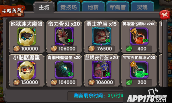 首先介绍的是主城商店,在这里,固定会刷新2种宝宝魔蛋,4种英雄或者宝宝装备,英雄和宝宝强化精华,还有就是装备进阶水晶,洗练石,首饰饰品以及扫荡券。基本上是每6个小时刷新一次商品,如果没有想要的商品,可花费若干水晶进行刷新。