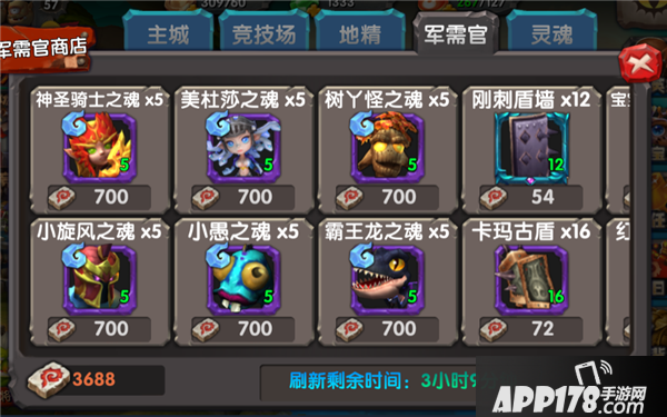 4.军需官商店。军需币获取途径:战场。目前开放的两种玩法:黑市竞技和战歌深林,在通关后都能获得大量的军需币。每次固定刷新英雄和宝宝灵魂各3种。另外刷新2种装备和其他商品。