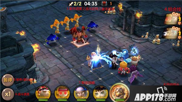 4.组合技:当特定英雄同时在场的时候,就会激活组合技。开战4回合后,英雄处于正常状态下,点击组合技按钮则可自由释放组合技。每场战斗每种组合技只可释放一次。