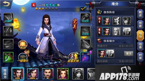 游戏中的侠客界面中设有缘分一栏,其中包含推荐阵容以及侠客缘分两个内容,前者是根据侠客们的属性推出的最适合的上阵阵容,后者则用数字展示了不同侠客同时上阵的属性加成。
