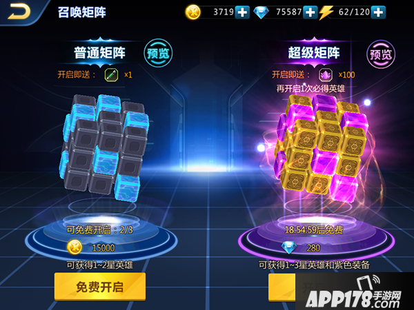 英雄召唤分为两个方式,一是花费金币和钻石从召唤矩阵中获得。召唤矩阵中有游戏里的全部英雄,在资金充裕的情况下,一定能抽到心仪的英雄。普通矩阵每天都有3次免费抽奖的机会,十连抽的价格也不高,抽到英雄的可能性非常大。超级矩阵每隔48小时就有一次免费抽奖的机会,第十次必定会抽取到英雄。