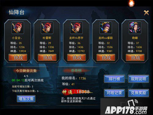 仙降台是副本玩法里,唯一的PVP副本。在这里你可以挑战同一服务器的其他玩家,获得更高排名!每日挑战次数有限,为3次,在每天的21点结算排名,获得相应的奖励,即使挑战失败,也可以获得参与挑战奖励哦!所以大胆挑战吧!