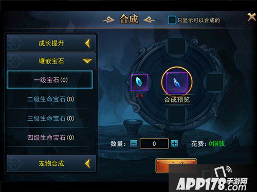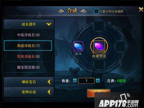 然后你可以选择合成的有三种:成长提升中的淬炼石合成,镶嵌宝石中使用的宝石合成,宠物系统中的宠物合成。