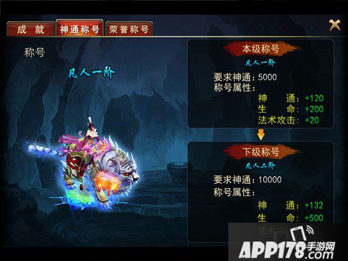 神通称号:初级是凡人,如果神通达到标准即可升入下一级,每个称号可以相应获得不同的称号属性哦!这是一个提升自己战斗力的好方法!
