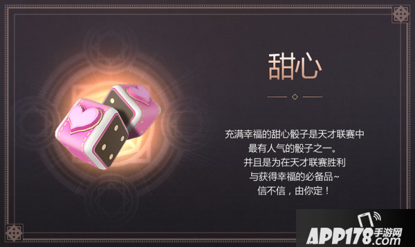 甜心骰子:充满幸福的甜心骰子是天才联赛中最有人气的骰子之一。并且是为在天才联赛胜利与火的幸福的必备品~信不信由你定!